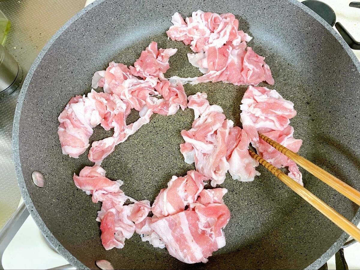 同じフライパンに豚肉を入れ、中火でほぐしながら炒めましょう。
