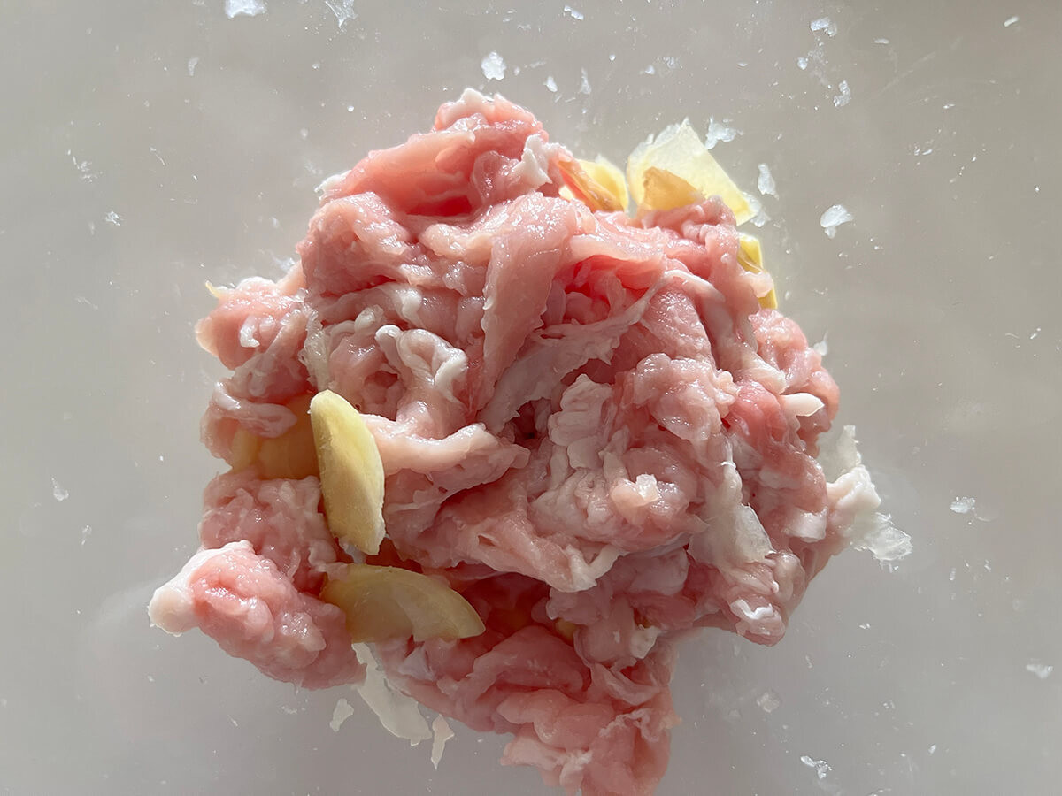 ボウルに豚肉を入れて、砂糖小さじ1/2、すりおろしたたまねぎ、しょうがを加えてもみ込みましょう。