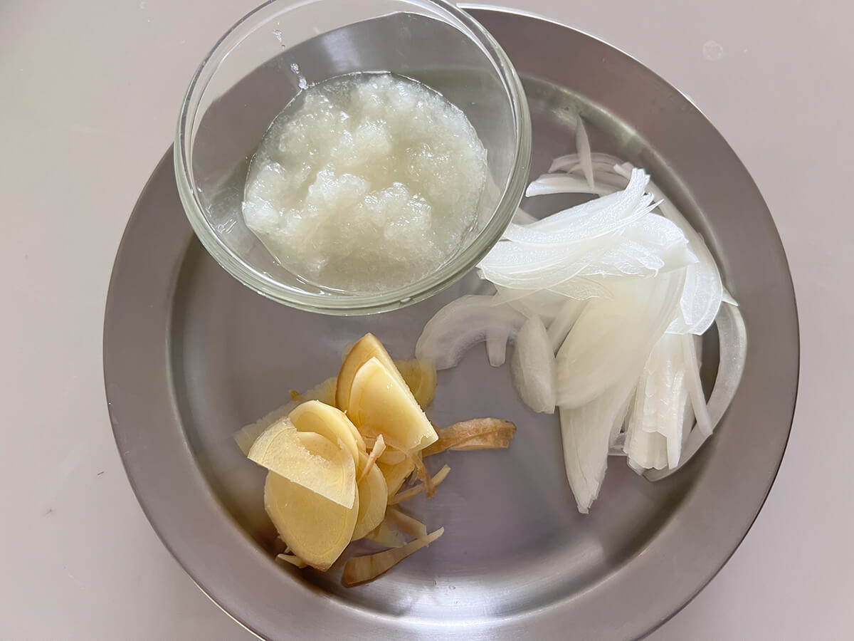 たまねぎの半量はすりおろし、残りは繊維に沿って薄切りにします。しょうがはよく洗って皮ごと薄切りにしておきましょう。