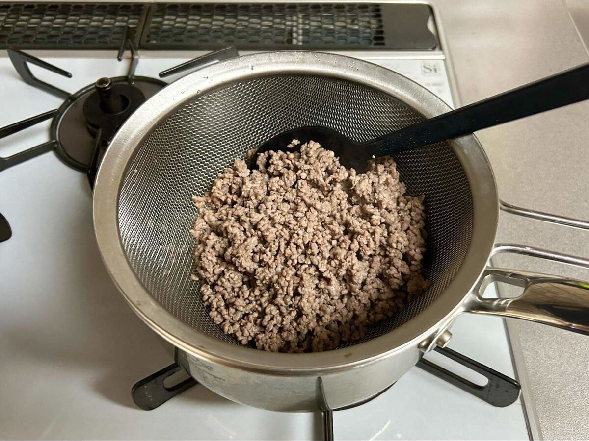 全体に火が通ると、たっぷりの脂が出てくるので、ザルに挽き肉を入れ、脂を切ります。