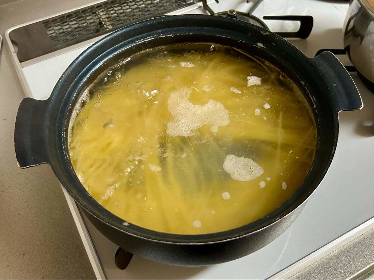 ミートソースを煮込んでいる間にパスタを茹でます。今回は、パスタのパッケージに記載されていた通りの時間で茹で上げました。