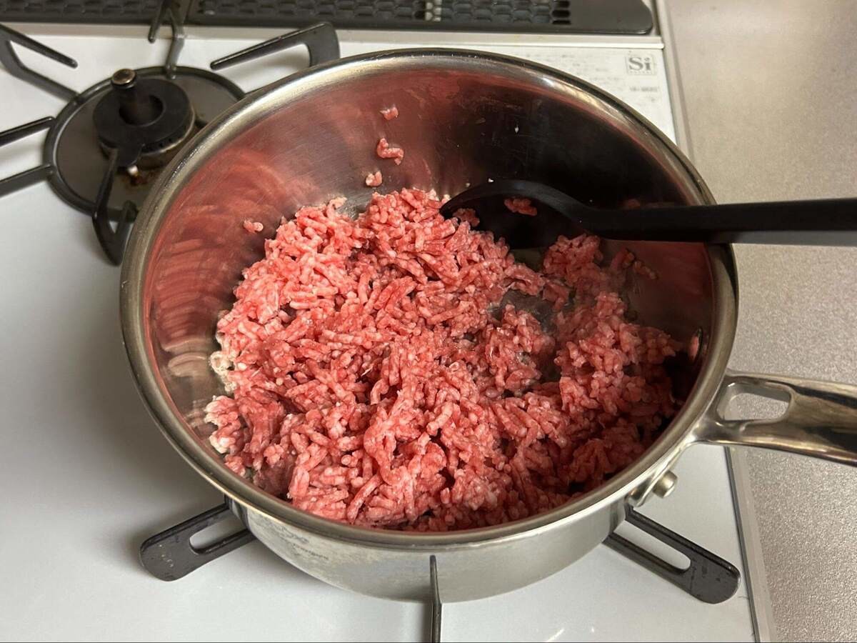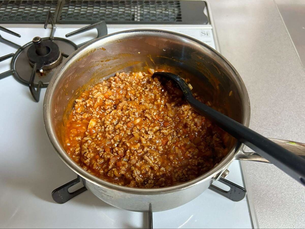 パスタを茹でるためのお湯を沸騰させるのは、結構時間がかかるため、挽き肉を炒め始めるタイミングで火にかけておくと時短になりますよ。