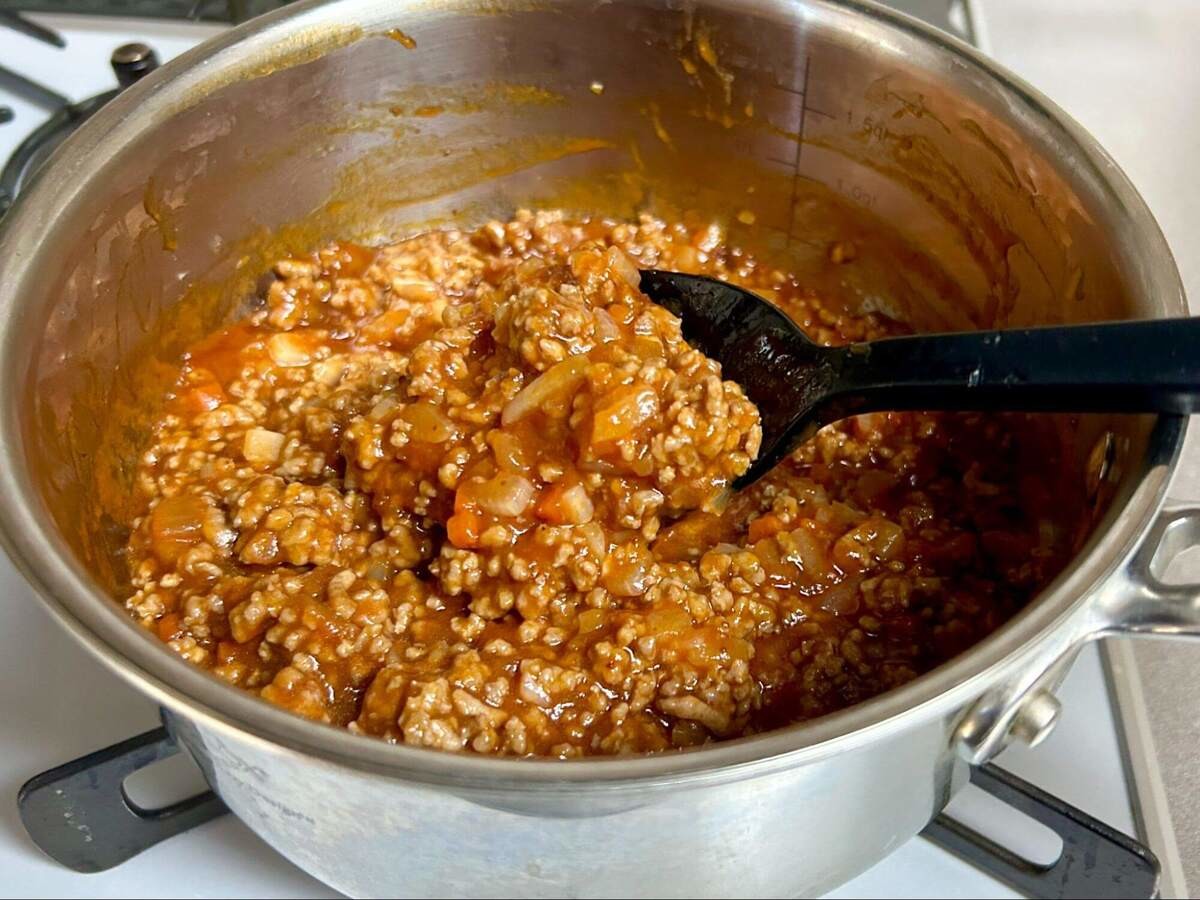 ②に炒めた挽き肉、ミートソース缶、ケチャップ、蜂蜜を加えて、軽く煮込みます。