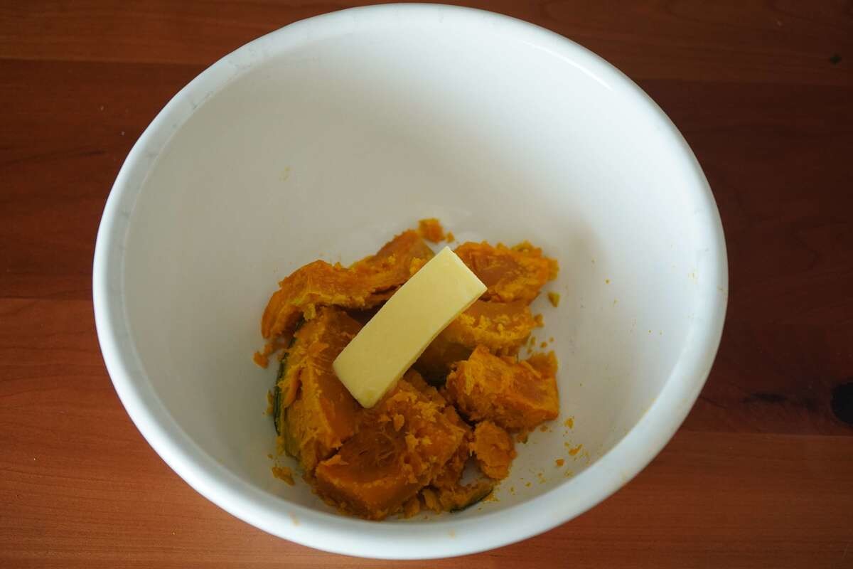 かぼちゃをボウルに入れて皮を取り除き、バターを加えてつぶします。