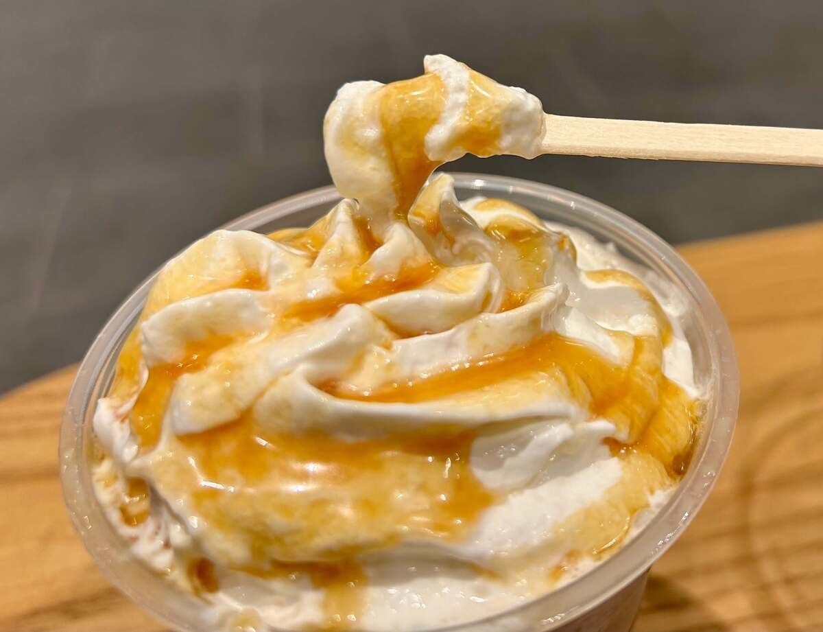 ホイップクリームと一緒にすくって、まずは一口。濃厚なキャラメルと芳醇なはちみつがホイップクリームが混ざり合うことで、甘党にはたまらない至福な味わいになっています。
