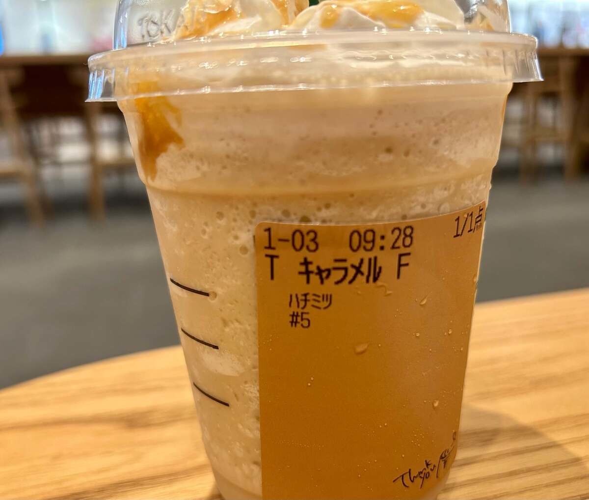 一見するといつものキャラメルフラペチーノに見えるかもしれませんが、ホイップクリームの上には黄金に光り輝くはちみつがいらっしゃいます。