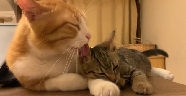 Xの動画に登場するのは、先住猫の「たぬきちゃん」と、新しく保護された子猫の「ねずみちゃん」。優しく寄り添うたぬきちゃんの姿に感動していたら……!?