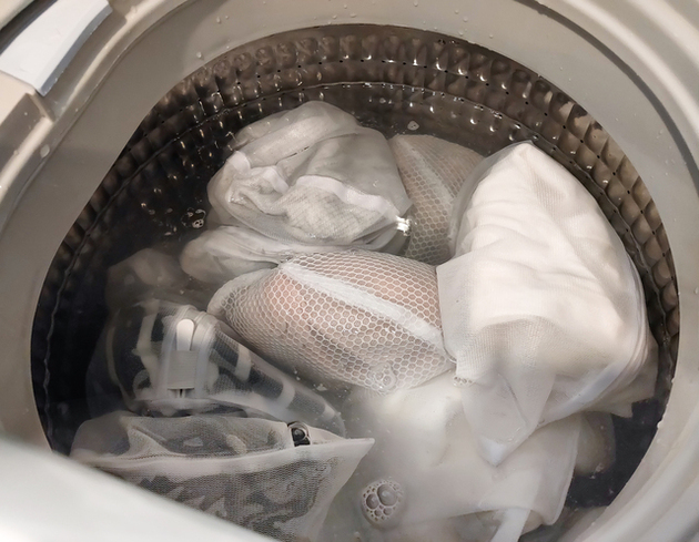手洗いで押し洗いするか、洗濯機の「手洗い・ドライ対応・おしゃれ着コースなどの弱水流コース」でやさしく洗いましょう。