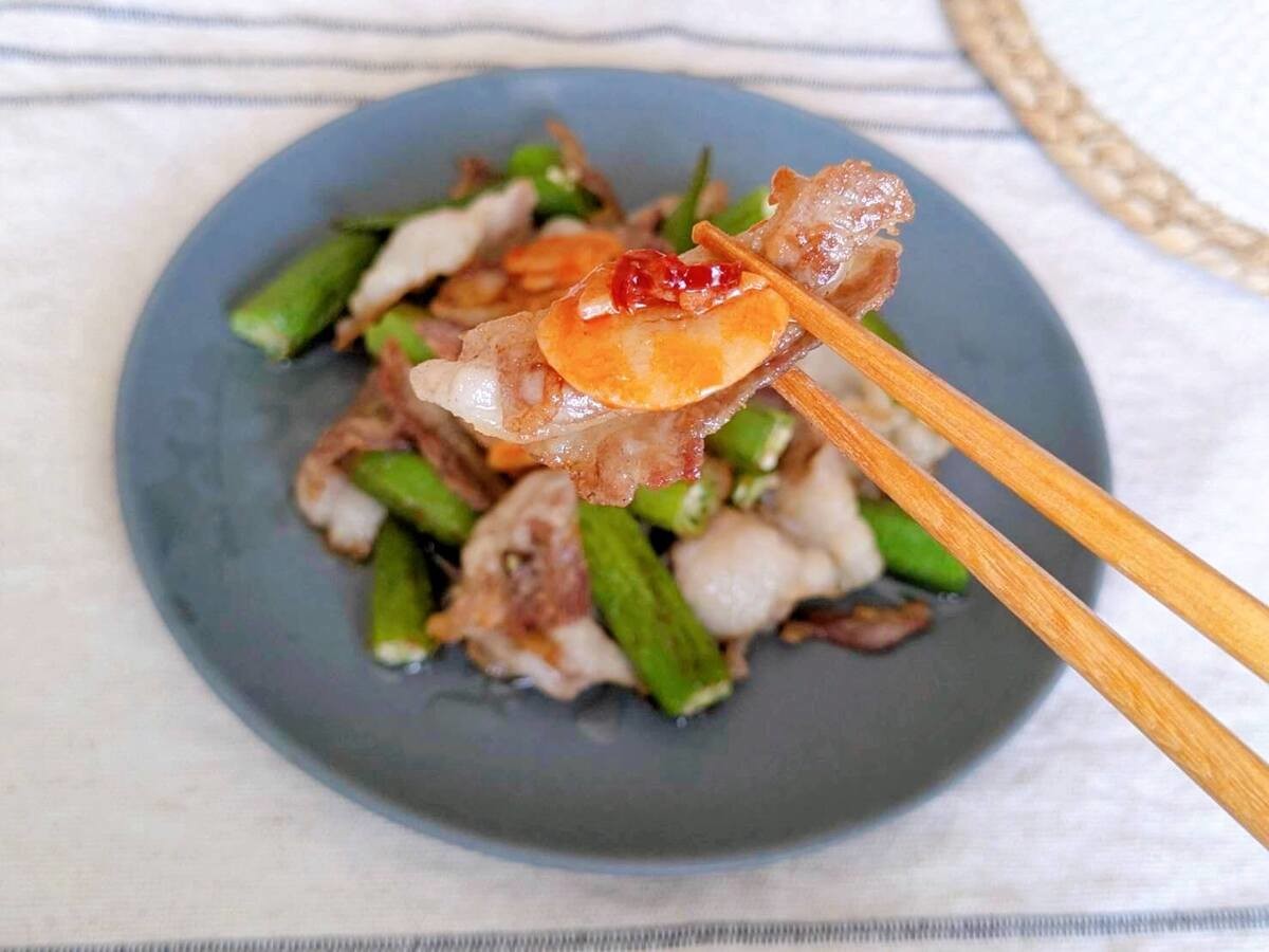 冷蔵庫にあった豚バラとオクラを焼いて軽く塩胡椒を振り「梅にんにく辣油」をのせたてみたら、これまたご馳走が爆誕……。