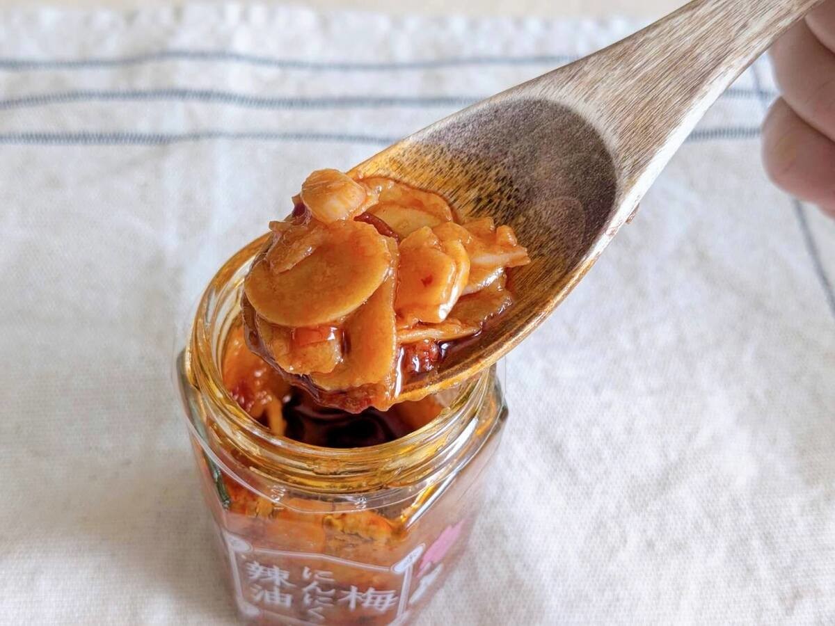 商品ジャンルは辣油ですが、液体よりもはるかににんにくの割合が多いのでどちらかというと、にんにく漬けです。このにんにくが驚くほどクセやえぐみがなくて、無限に食べられるんですよね。