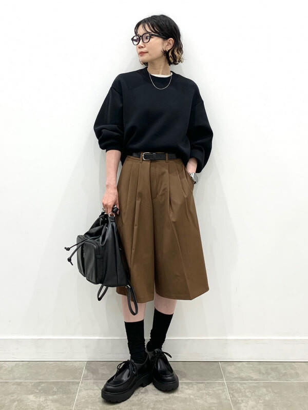 この秋注目の「バミューダショートパンツ」を取り入れた、マニッシュなコーディネート。子どもっぽくなりがちなショートパンツも、シックな配色と着こなしで大人仕様に。