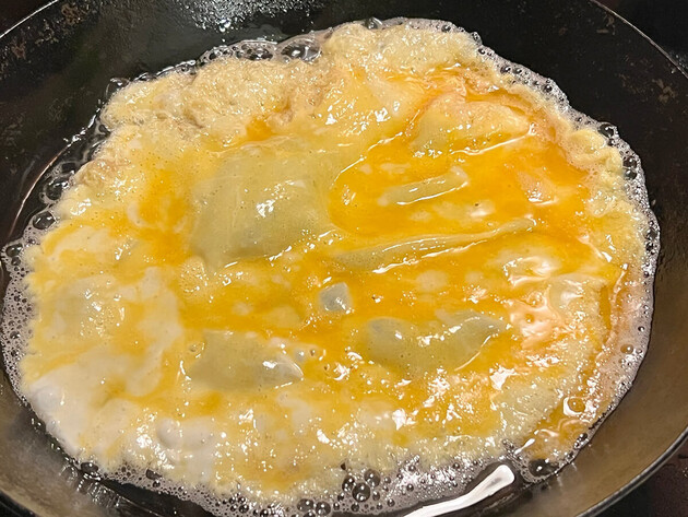 そして鉄のフライパンが重すぎて、片手で扱えないので、もう一方の手で皿の方を持ってくるということも出来ず……!