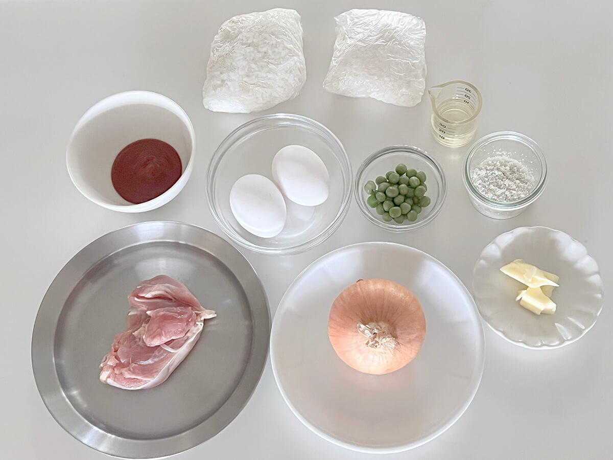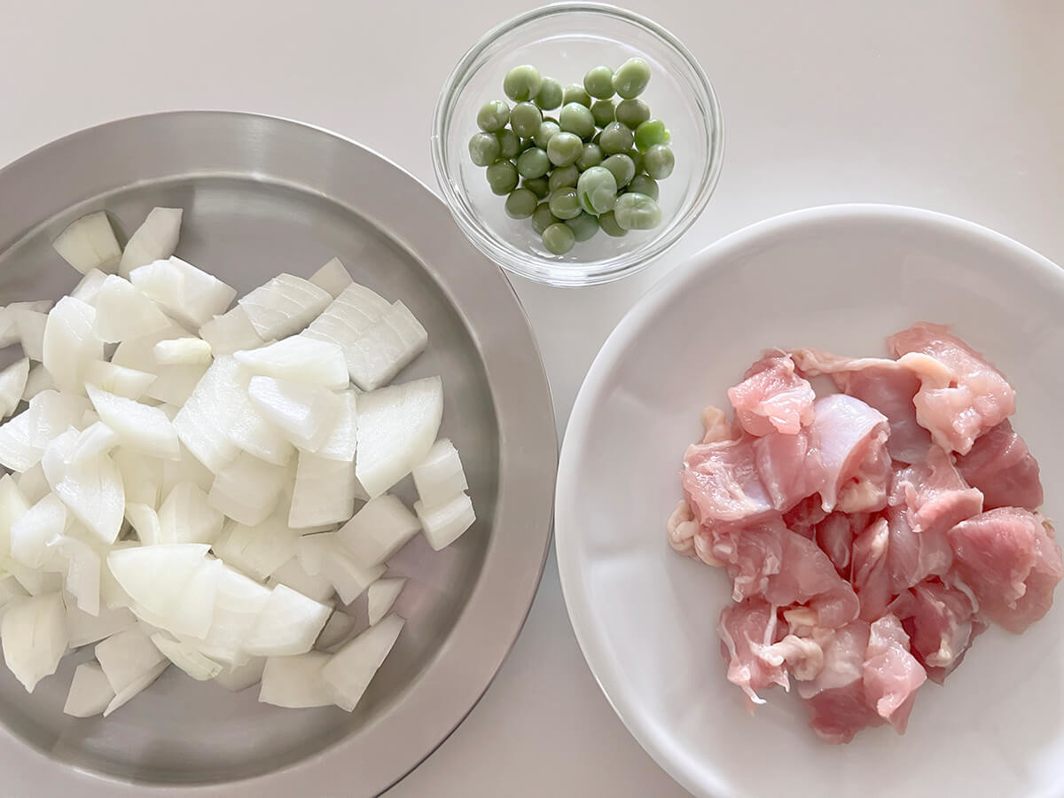 今回グリンピースは缶詰のものを準備しましたが、普段ならおそらく緑ものはピーマンで代用するかなと思います。