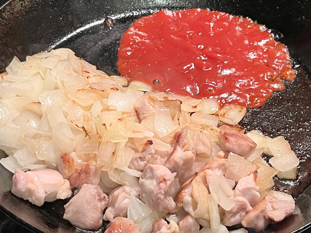 焼き色がつけばケチャップを入れ、ケチャップも少し焼きつけましょう。