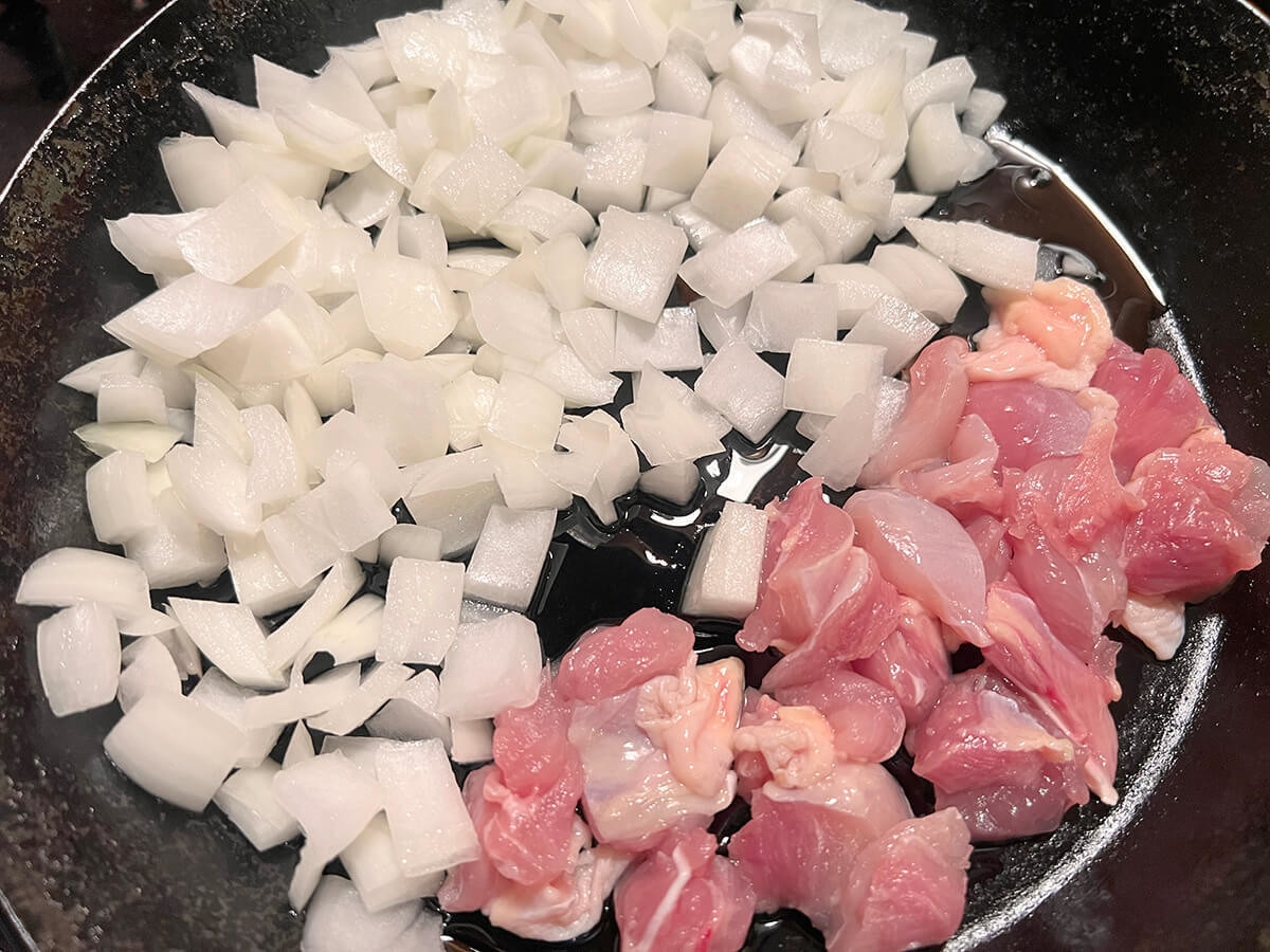 鶏肉はさいの目大に切り、玉ねぎは色紙切りにします。