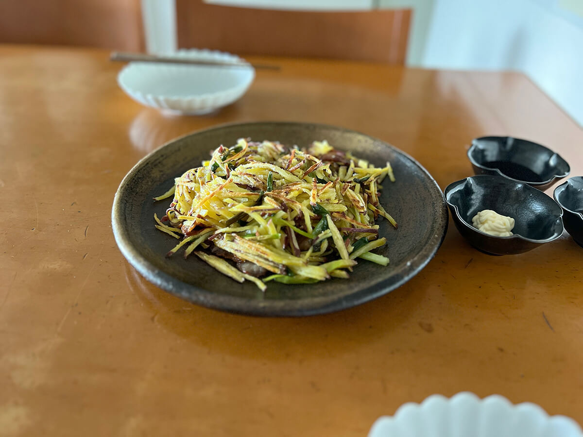 カリッと焼けたさつまいもの、ふっくらねっとりした甘みに、ねぎの味わいと豚肉の塩気が混じります。食べたことのない感じ。何もつけなくても十分にいただけます。これは、後を引くぞ。