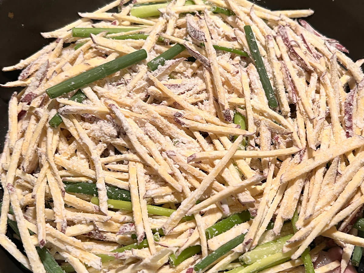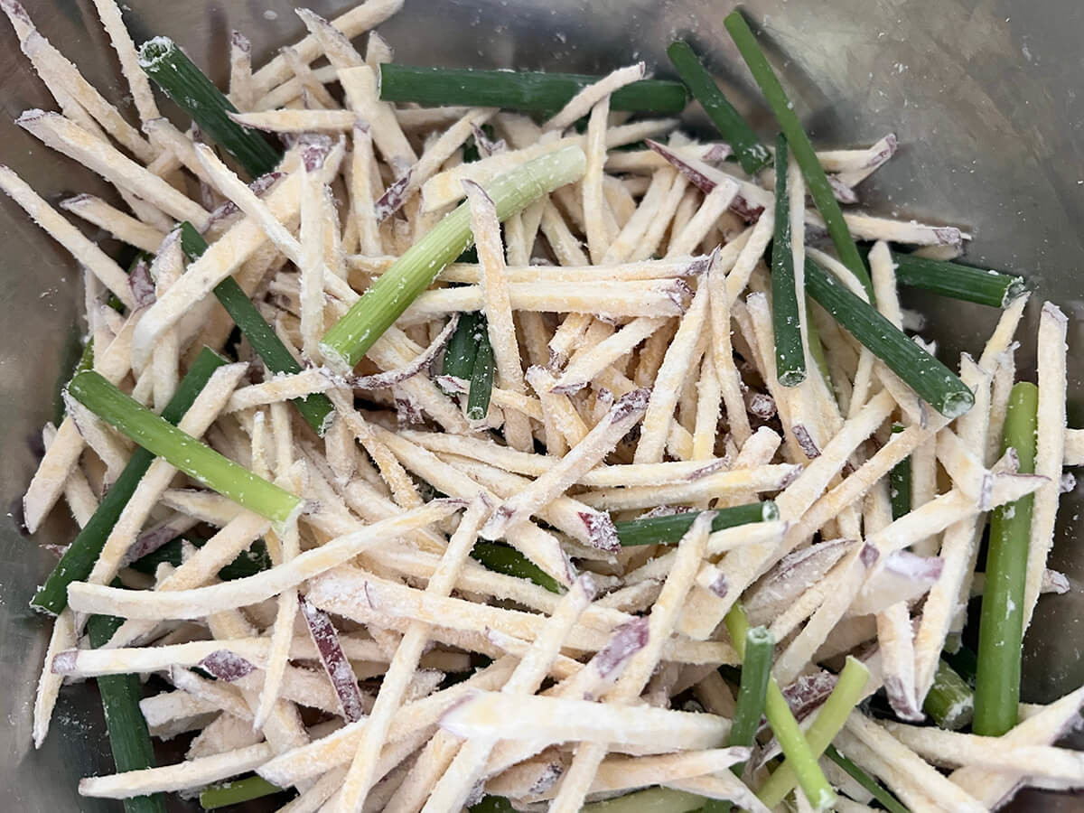 作り方②さつまいもとねぎに片栗粉と調味料をまぶす