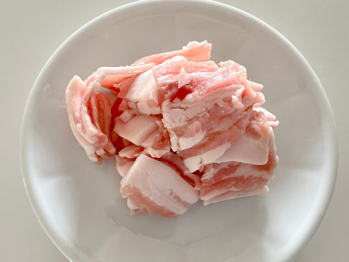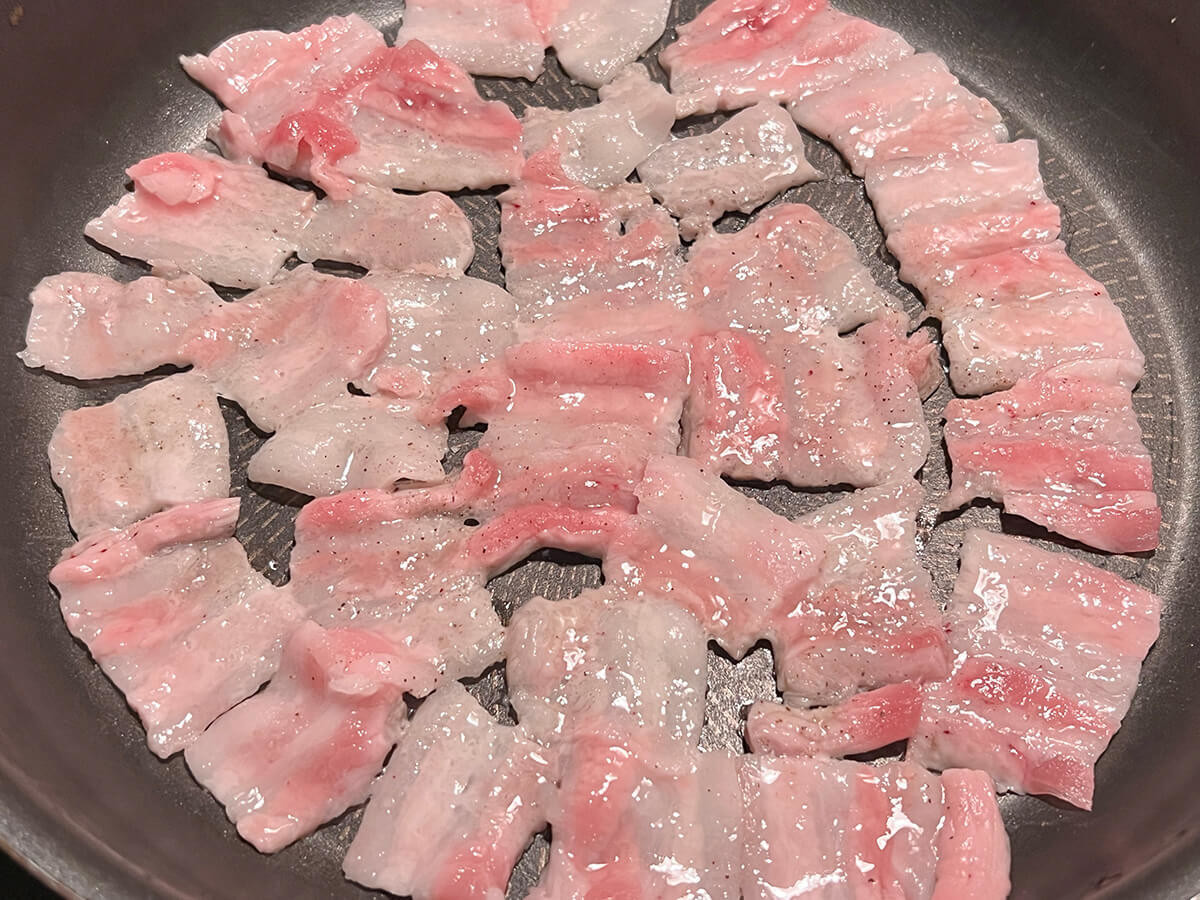 フライパンに豚肉を並べて塩・こしょうをふり、中火にかけます。