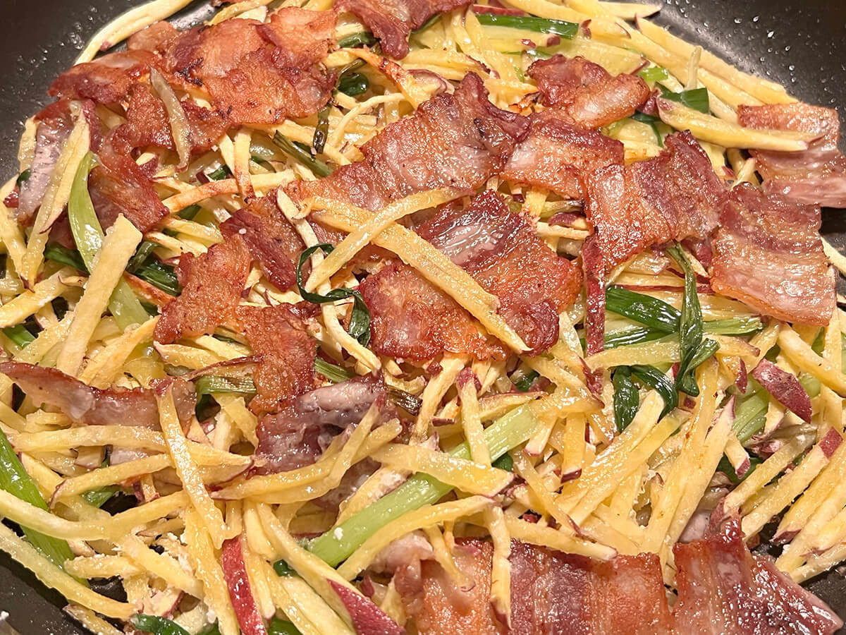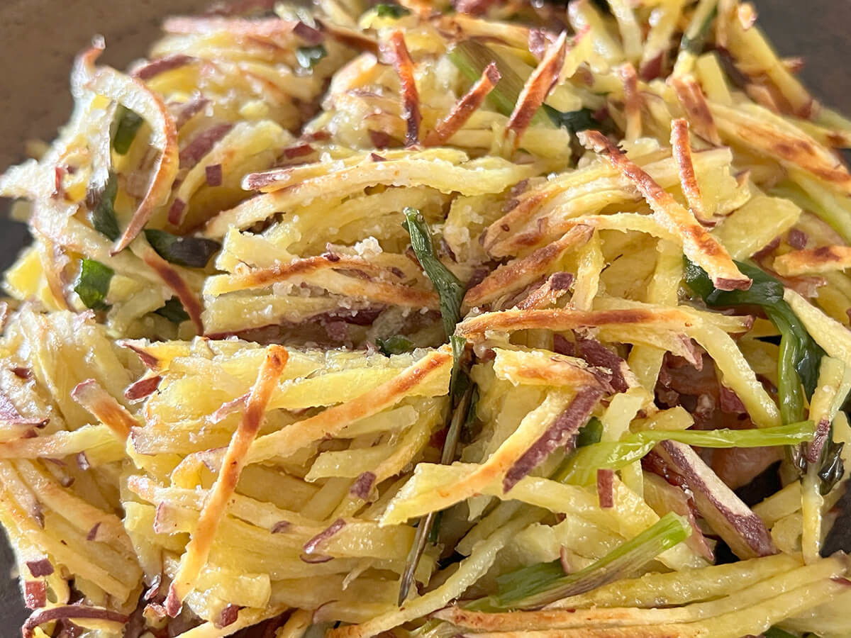 こんな風に芋を細切りにして重ね、ジュっと焼き色がつくまで焼くのは、何かに似てると考えて、ハッシュブラウン(またはハッシュドポテト)に思い至りました。なるほどね。