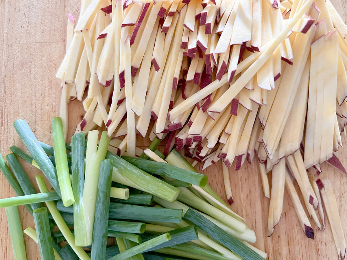 さつまいもは洗い、皮ごと7cm長さの細切りに、細ねぎは7cm長さにします。