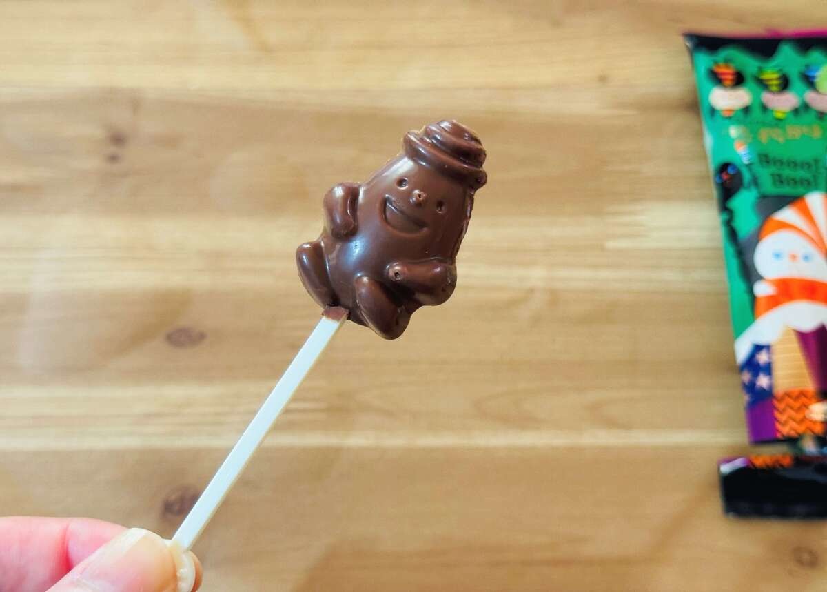 袋から出すと、おばけの形をしたチョコがスティックに刺さっています。大きさはスティックの先からチョコの先までで約10㎝程度。