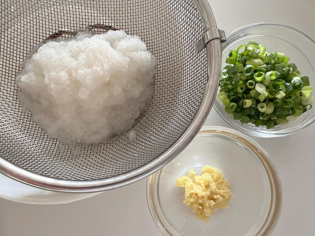 しょうがはすりおろし、万能ねぎは小口切りにしておきましょう。