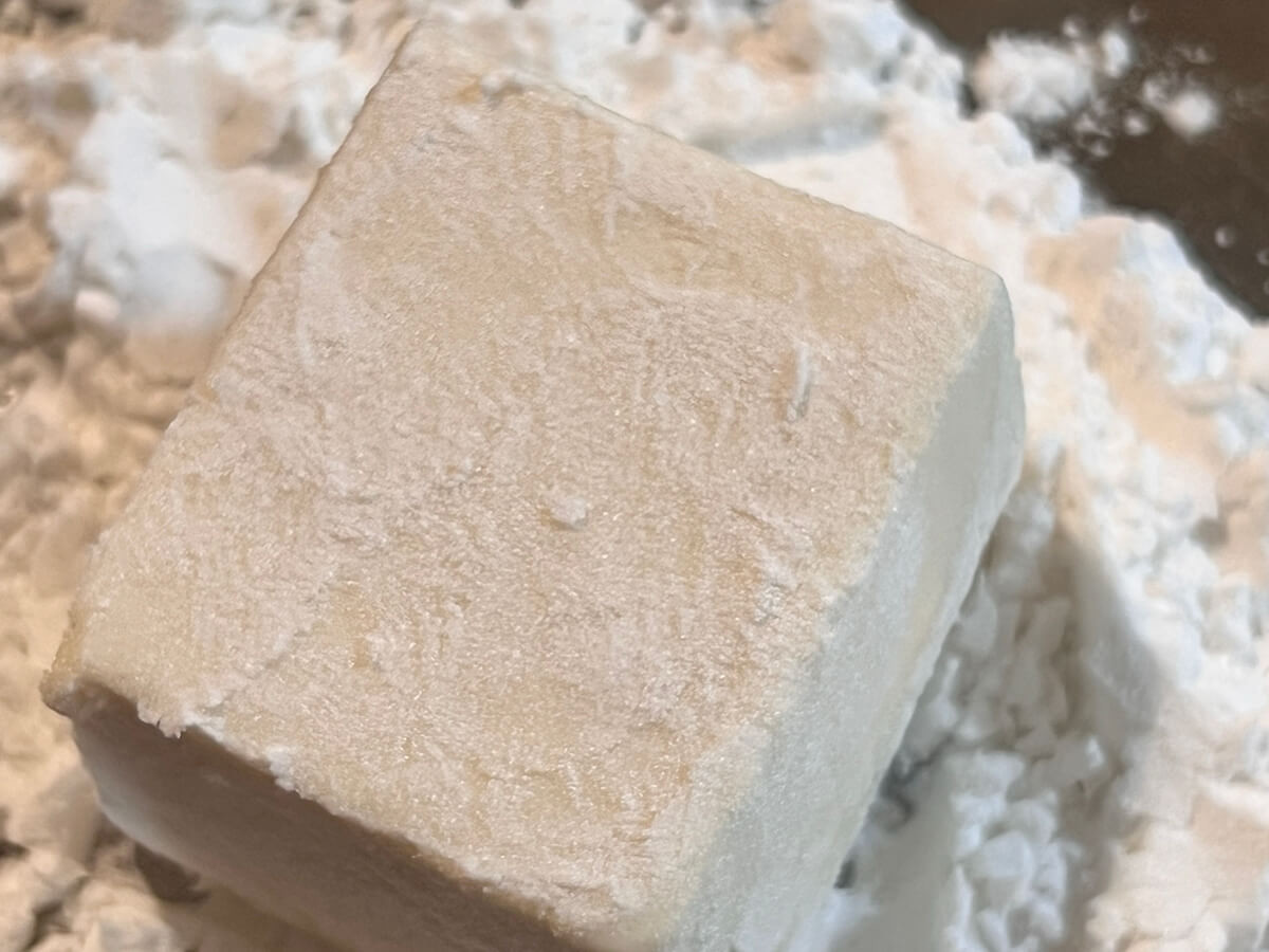豆腐に片栗粉をまぶしてフライパンに入れ、下面がかたまってきたら、返しながら2〜3分かけて全面を揚げましょう。