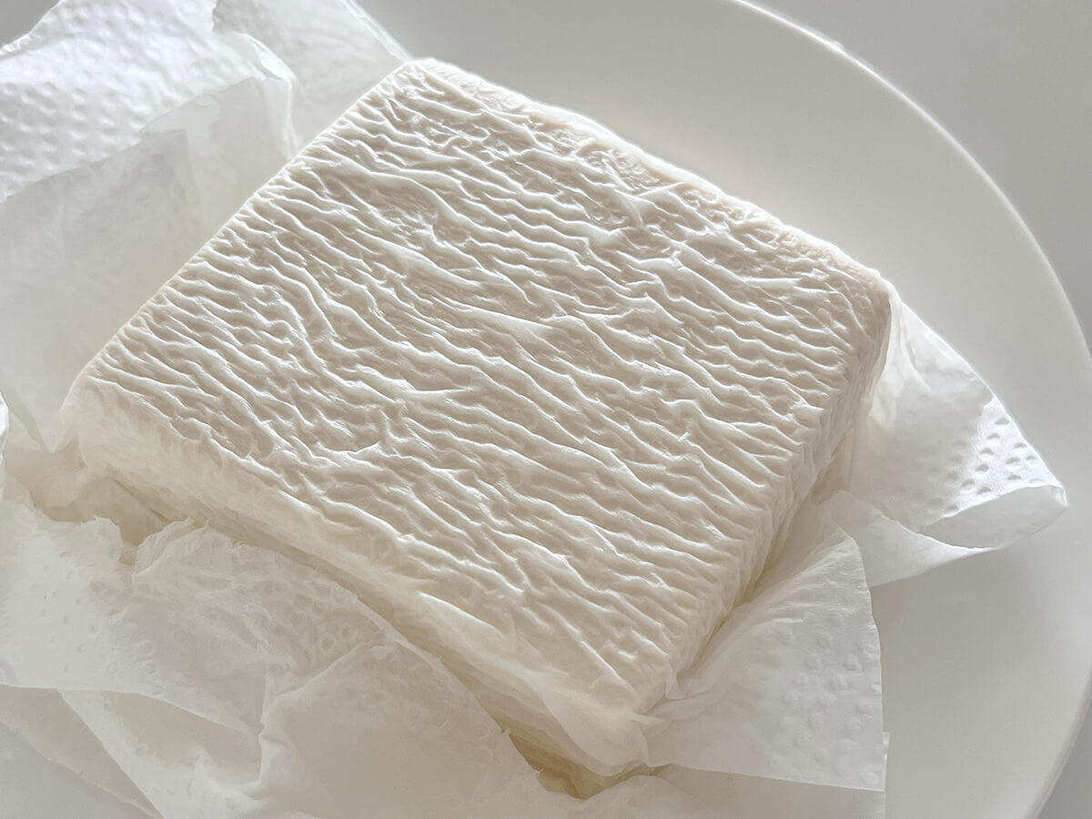 豆腐はペーパータオルに包み、10分以上おいて水きりをします。4等分にやっこに切っておきましょう。