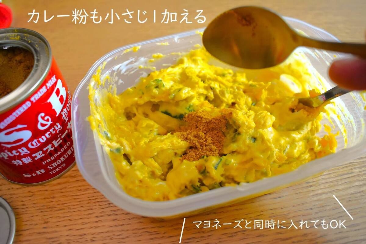 【作り方2.】粗熱をとったらマヨネーズとカレー粉を入れて混ぜる