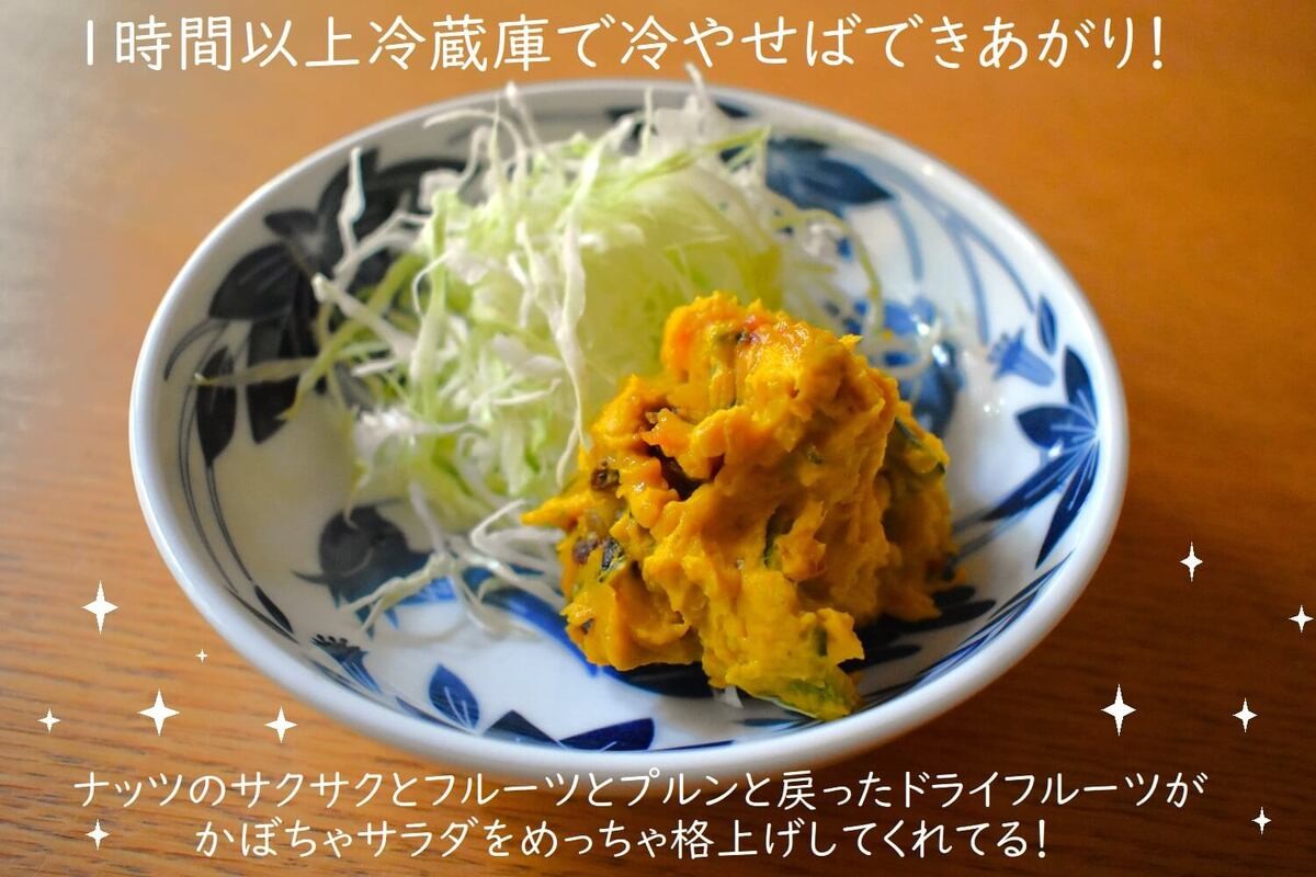 1時間以上冷やしてできあがりです!この冷やしている間に、かぼちゃサラダの水分をドライフルーツがよく吸い取ってくれるので、かぼちゃサラダがもったりとして、ナッツはサクサクのまま、ドライフルーツはプルンッとした舌ざわりに変身!