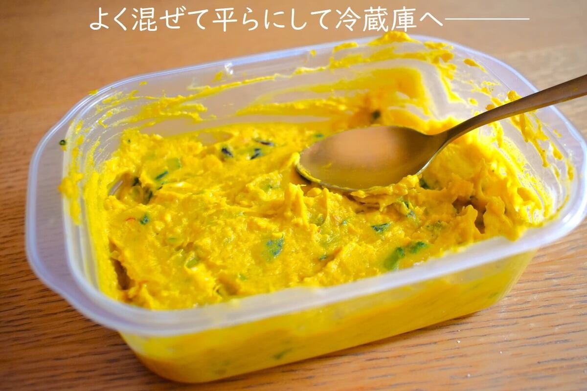 【作り方4.】かぼちゃのサラダに3を入れてまぜて冷蔵庫へ