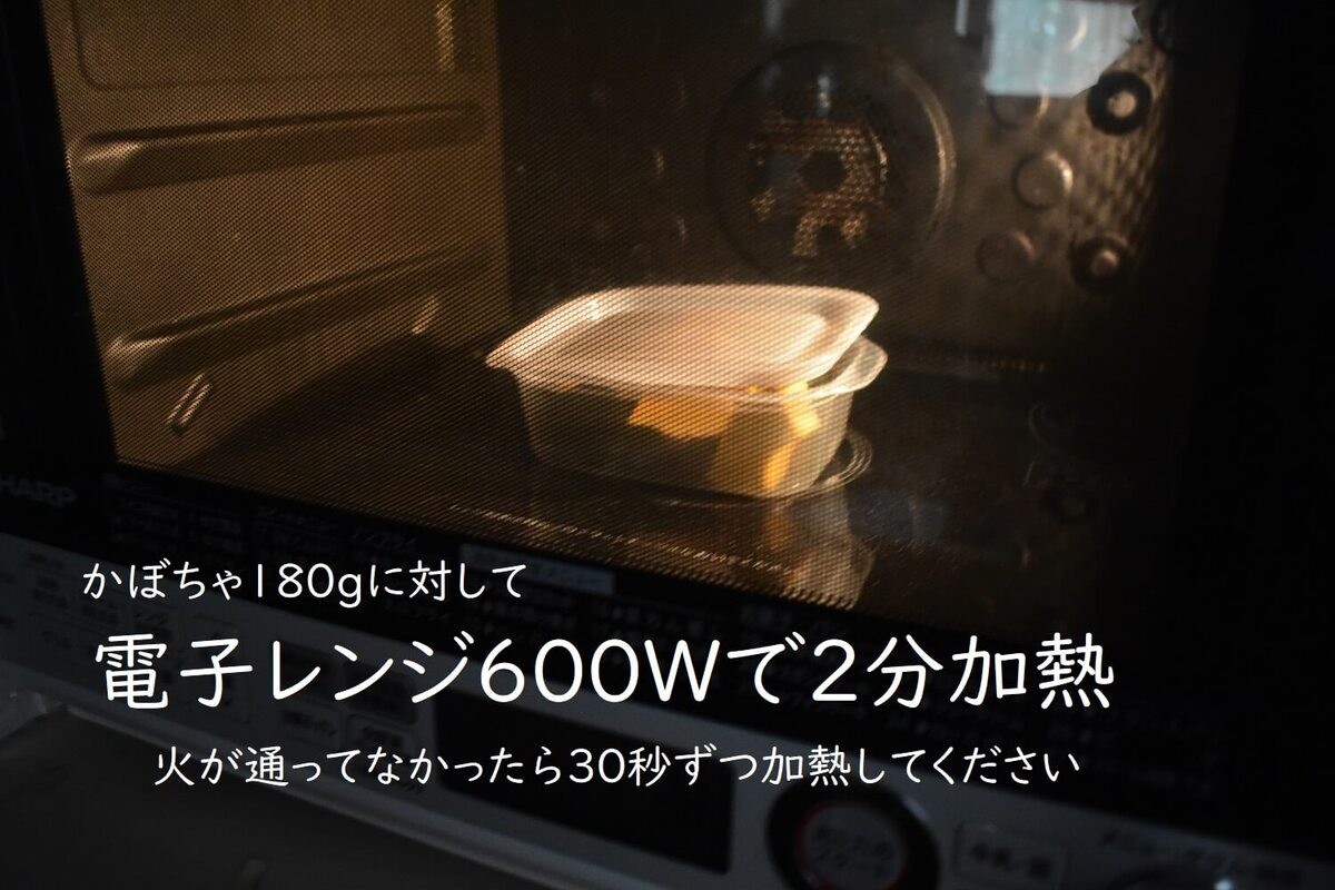 もし、まだかたかったら、少しずつ加熱して様子を見てください。ちなみに、筆者の今回のかぼちゃは水っぽいタイプなので2分で完璧に火が通りました。