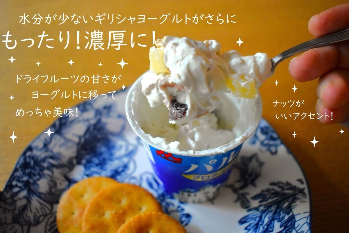 ドライフルーツが水分を吸って、ギリシャヨーグルトがまるでクリームチーズのように濃厚に!そのまま食べても、ドライフルーツの甘みが移っておいしいんです。
