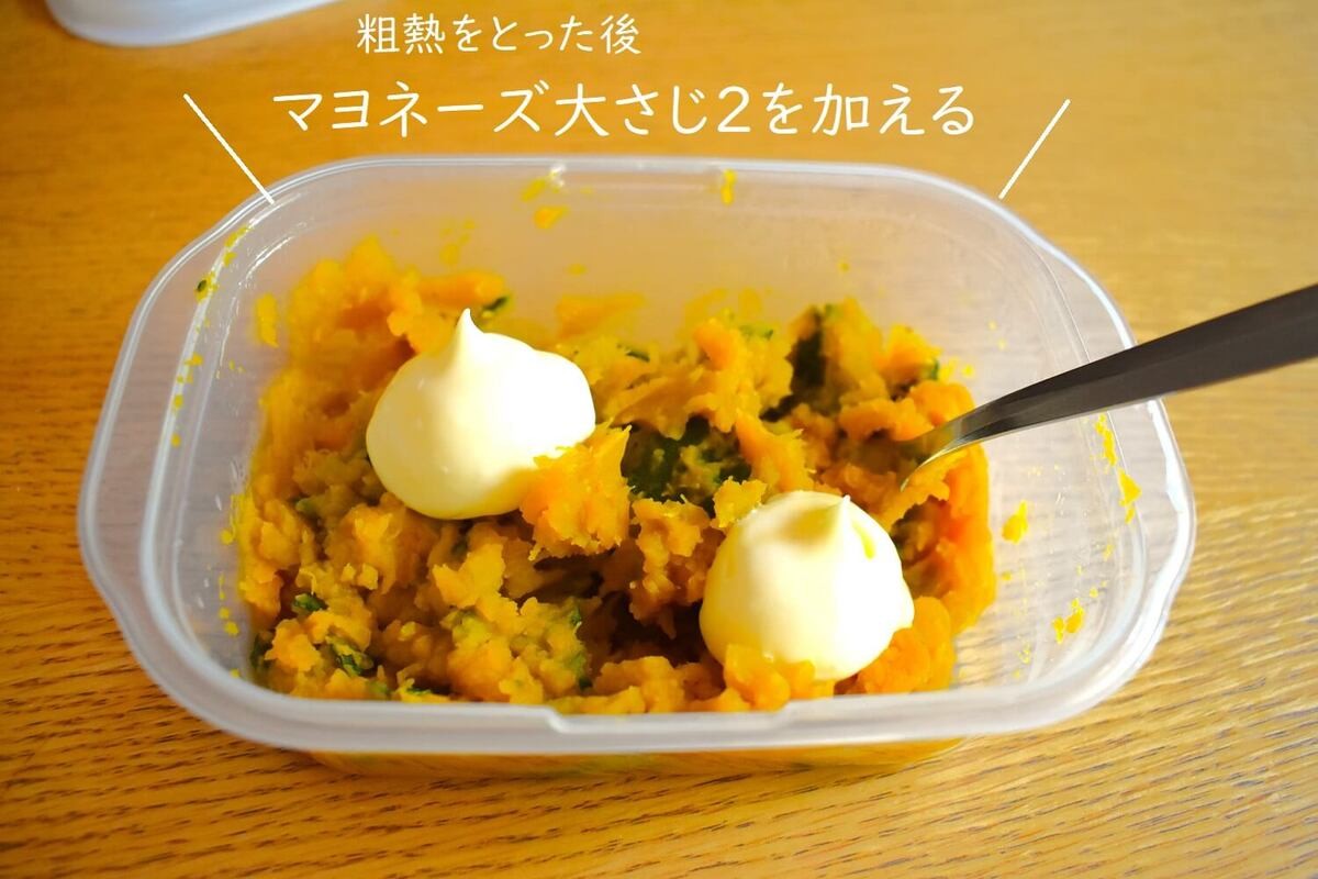 つぶした後、粗熱をとったかぼちゃに、マヨネーズを入れてよく混ぜます。