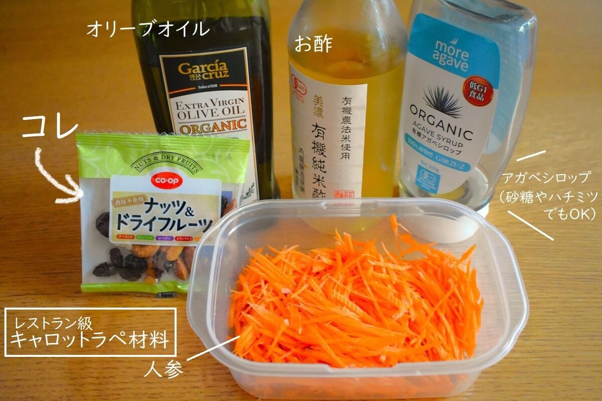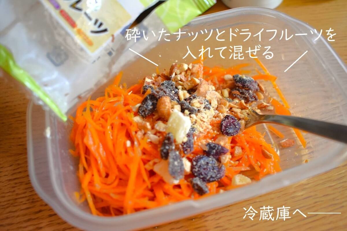 同じく「ドライフルーツとナッツ(小分け)」があれば、キャロットラペもとっても簡単に格上げレストラン級の味に!材料はこちら。