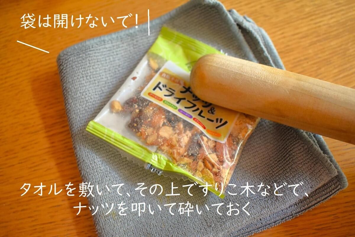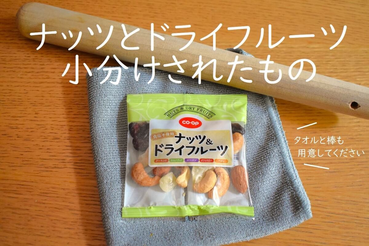 ここで登場!ナッツとドライフルーツ(小分け)を“開封せず”、タオルを敷いて、すりこ木などの棒状のものでナッツを叩いて砕きます。