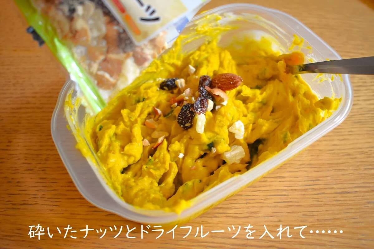 かぼちゃサラダに砕いたナッツとドライフルーツ(小分け)を1袋全部入れます。