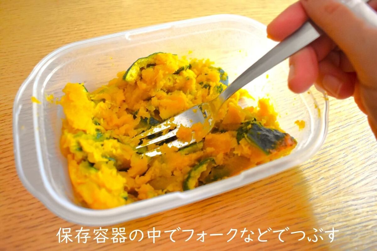 あらくつぶすか、細かくつぶすかはお好みで!ちなみに、かぼちゃの皮も歯応えがいいので、筆者は一緒につぶします。
