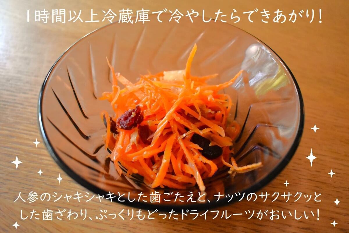 1時間冷蔵庫で寝かすことで、ドライフルーツがぷっくりと戻って人参のシャキシャキとナッツのサクサクとあわさって、人参だけの時よりずっと高級な味に!