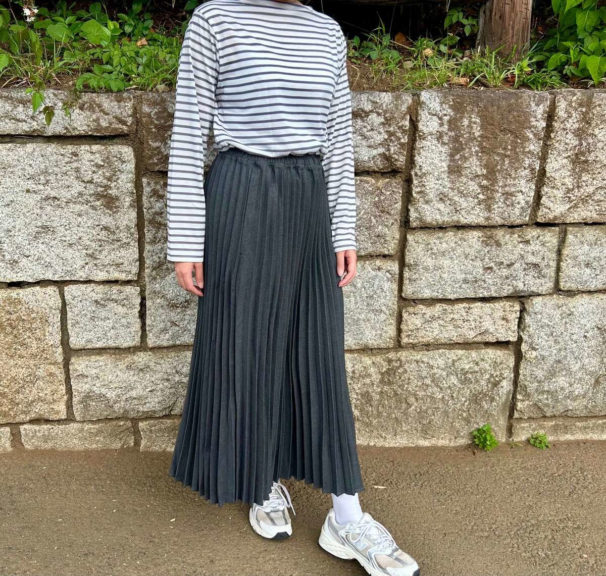 同じくワークマンでゲットしてきた「撥水ウールライクプリーツスカート」と合わせれば、きれいめカジュアルに着こなせます。