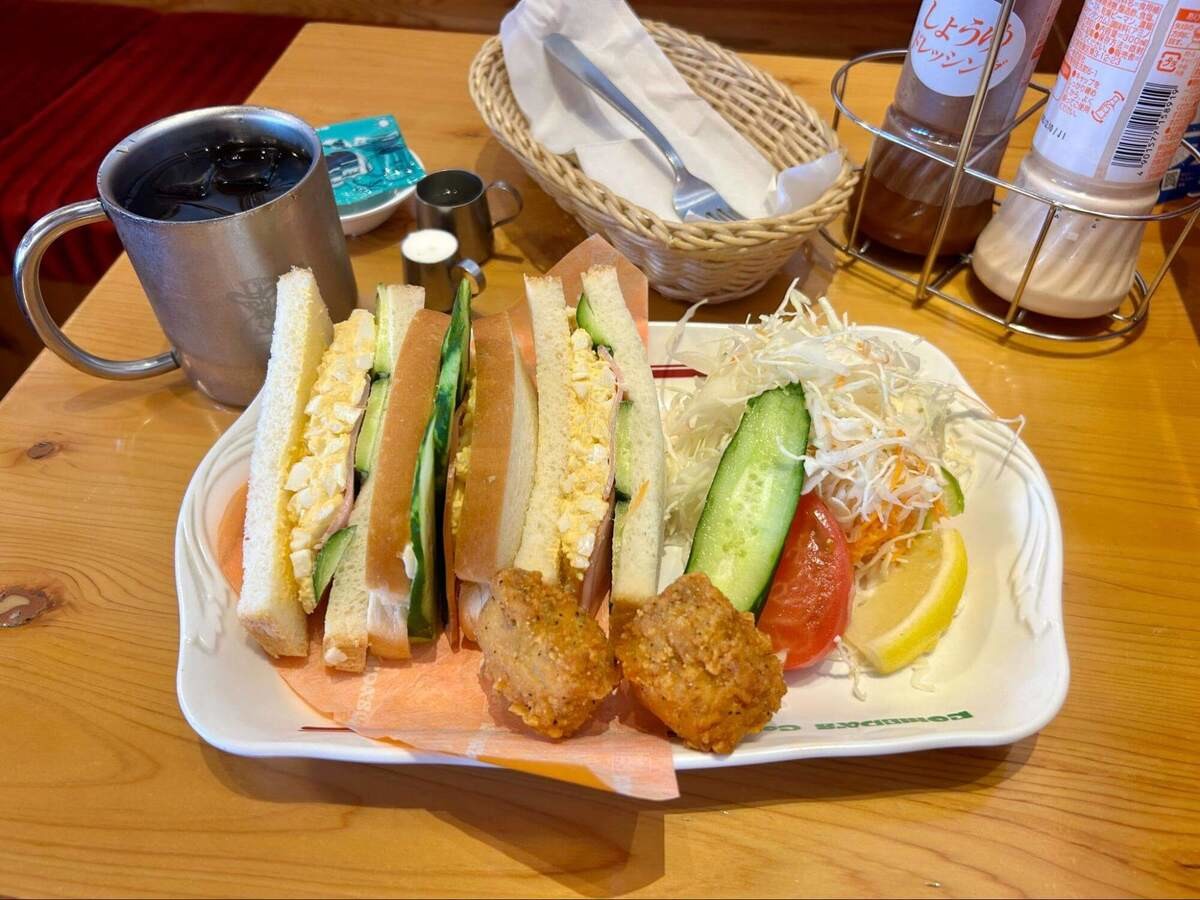 「昼コメプレート」はいくつか種類があり、今回は「ミックスサンド コメチキ2ケ付き」を選びました。ドリンクは定番の「アイスコーヒー」をいただくことに。