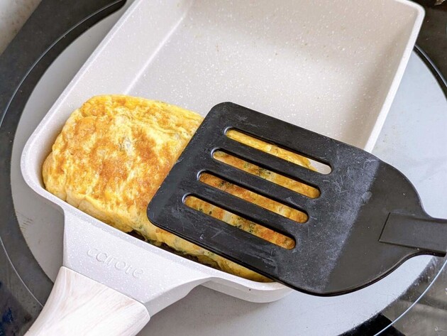 玉子焼をフライパンの側面に押し付けて軽く焼くと、きれいに仕上がりますよ。