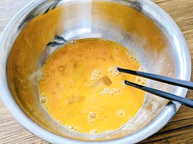 卵をボウルに割って溶きほぐし、調味料を加えて混ぜます。
