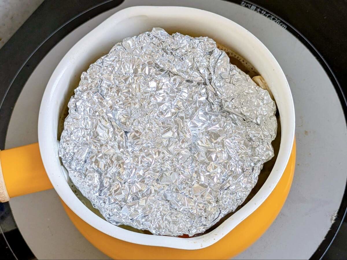 こうすることで、アルミホイルの凹凸にアクが吸い寄せられるようにくっつきます。ひと煮立ちしたらアルミホイルを取り出してください。