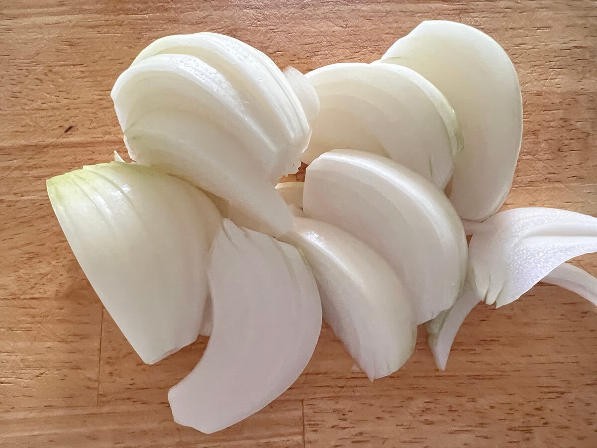 玉ねぎは縦半分に切って1cm幅のくし形に切ります。