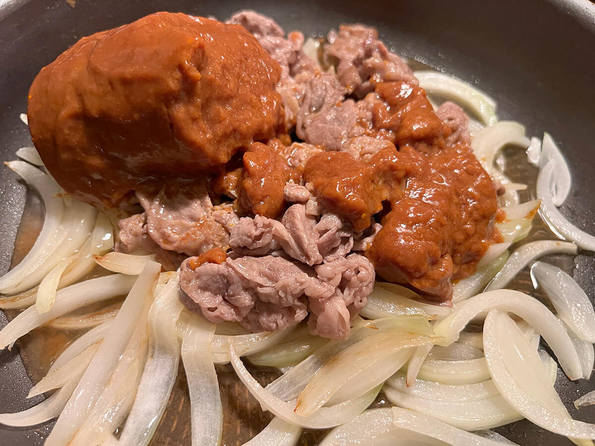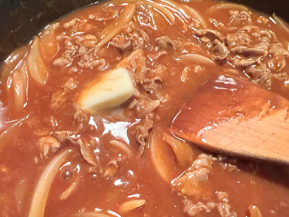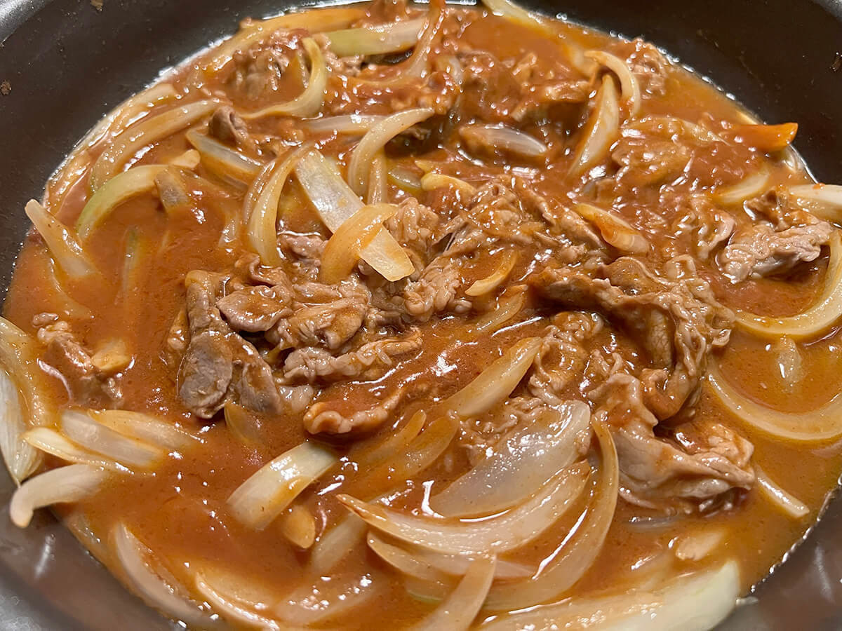 作り方③玉ねぎを炒め、牛肉、デミグラスソース、野菜ジュースとともに煮る