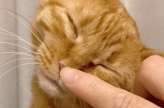 動画では、飼い主さんに耳のあたりを触られたあと、その指先を鼻に近づけられるつぶちゃん。すると……?