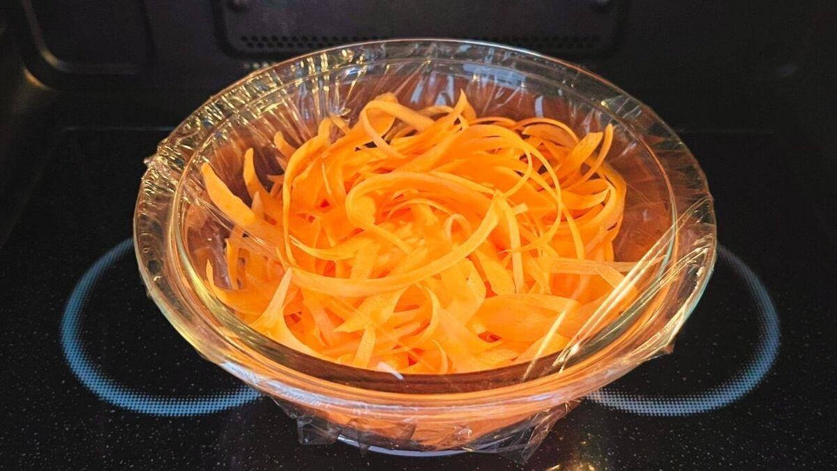 洗って皮を剥いたにんじんを、ピーラーで薄くスライスし、耐熱容器に移します。