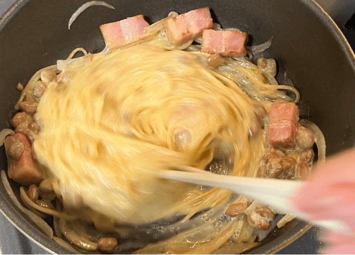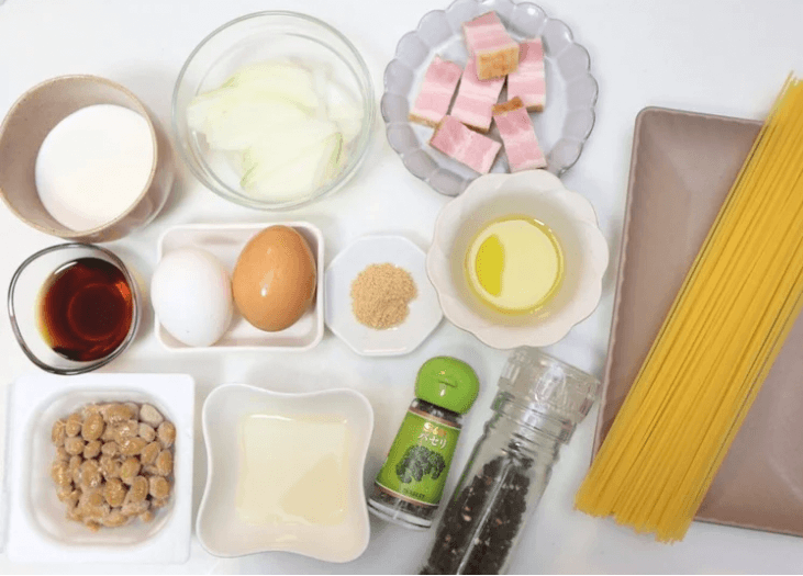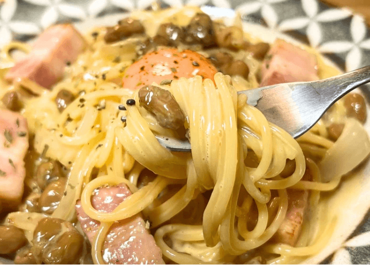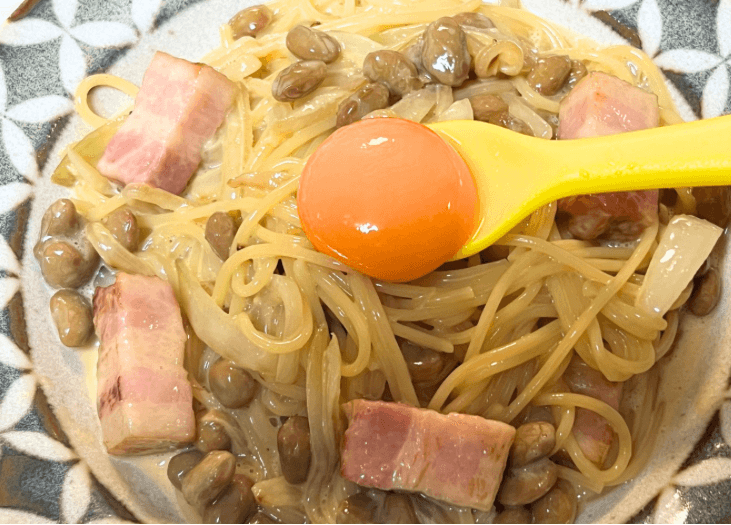今回は、関西テレビ『土曜はナニする!?』で紹介された「濃厚和風ねばボナーラ」を、「納豆創作料理 夏豆」ファンとして再現してみました♡