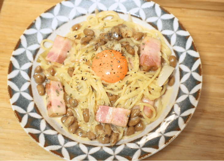 一見普通のカルボナーラにも見えますが、やはり大粒納豆の存在感は隠しきれません(笑)。